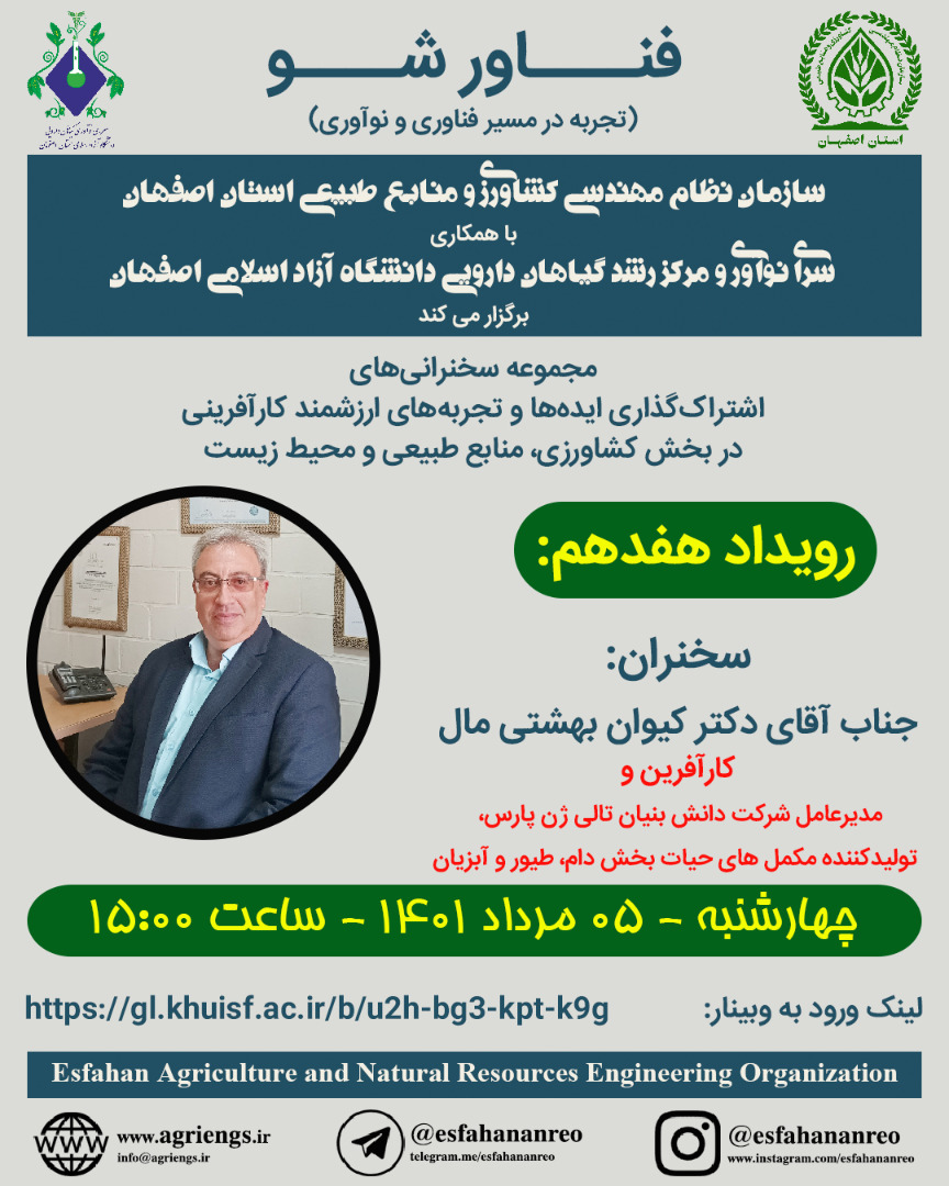 در مجموعه سخنرانیهای اشتراک گذاری ایدهها و تجربههای ارزشمند کارآفرینی در بخش کشاورزی، منابع طبیعی و محیط زیست که به همت سازمان نظام مهندسی کشاورزی و منابع طبیعی استان اصفهان با همکاری سرای نوآوری و مرکز رشد گیاهان دارویی دانشگاه آزاد اسلامی اصفهان برگزار خواهد شد، جناب آقای دکتر کیوان بهشتی مآل، کارآفرین و مدیرعامل شرکت دانش بنیان تالی ژن پارس در مورد بایدها و نبایدها، چالش ها و ضرورت تولید محصولات دانش بنیان در حوزه مکمل های دام، طیور و آبزیان سخنرانی داشتند.